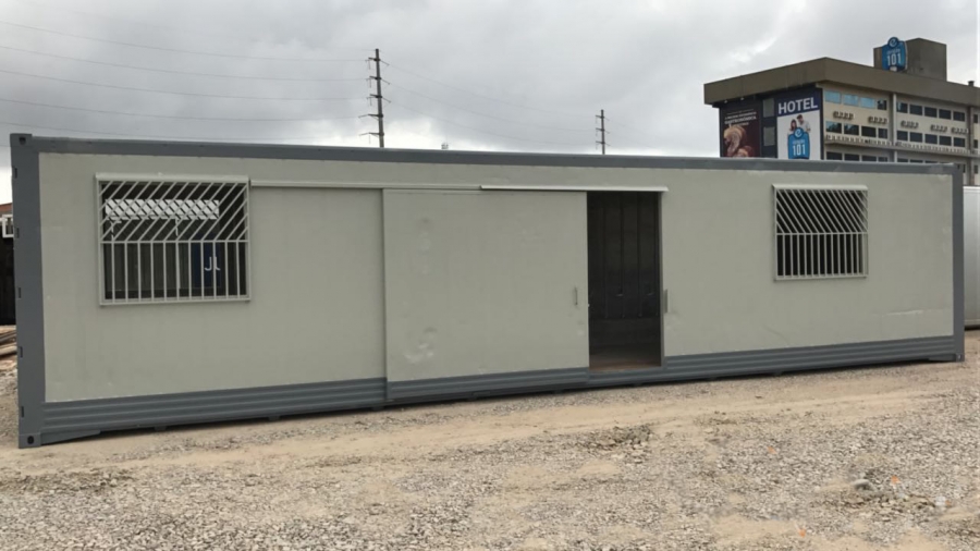Container Reefer 40 pés (12 metros) com porta frontal de correr utilizando e porta dos fundos utilizando material de container, janelas, abertura para ar condicionado e piso em porcelanato texturizado.
